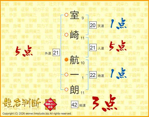 室(9画)崎(11画) 航(10画)一(1画)朗(11画)