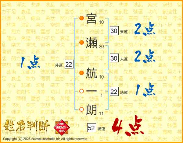 宮(10画)瀬(20画) 航(10画)一(1画)朗(11画)