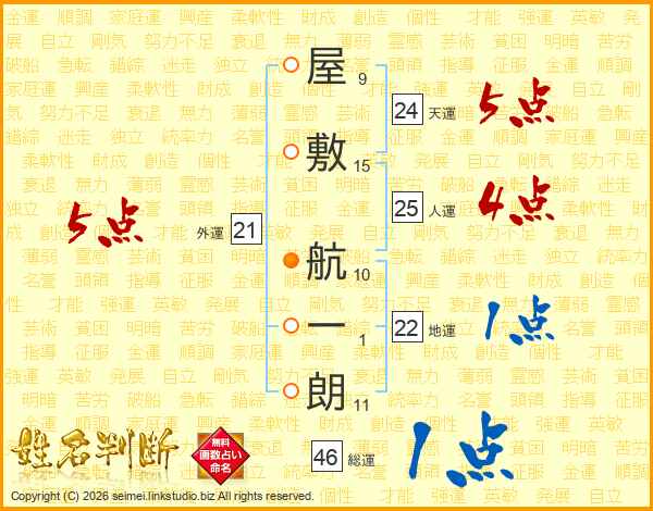 屋(9画)敷(15画) 航(10画)一(1画)朗(11画)