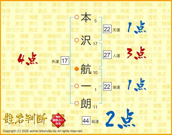 本(5画)沢(17画) 航(10画)一(1画)朗(11画)