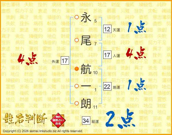 永(5画)尾(7画) 航(10画)一(1画)朗(11画)