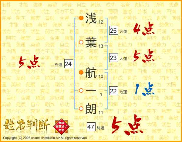 浅(12画)葉(13画) 航(10画)一(1画)朗(11画)