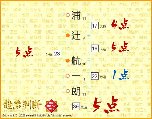 浦辻航一朗さんの人運は16画の5点!