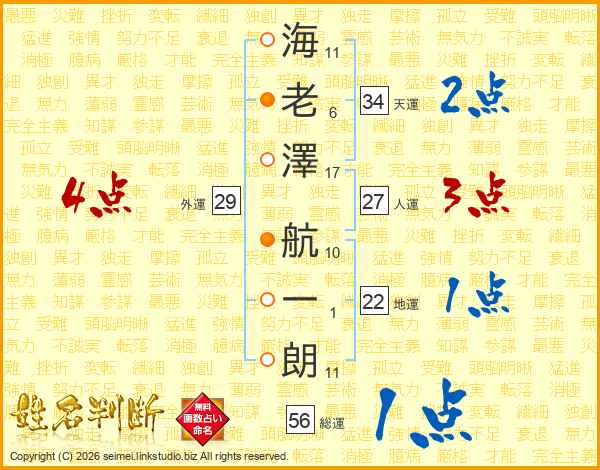 海(11画)老(6画)澤(17画) 航(10画)一(1画)朗(11画)