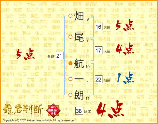 畑(9画)尾(7画) 航(10画)一(1画)朗(11画)