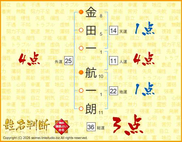 金(8画)田(5画)一(1画) 航(10画)一(1画)朗(11画)
