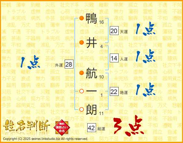 鴨(16画)井(4画) 航(10画)一(1画)朗(11画)