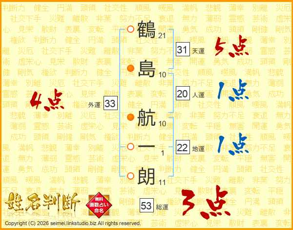 鶴(21画)島(10画) 航(10画)一(1画)朗(11画)