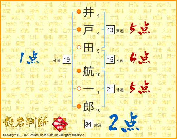 井(4画)戸(4画)田(5画) 航(10画)一(1画)郎(10画)