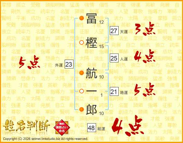 冨(12画)樫(15画) 航(10画)一(1画)郎(10画)