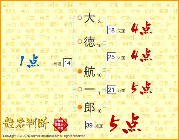 大(3画)徳(15画) 航(10画)一(1画)郎(10画)