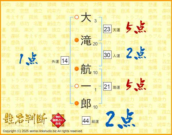 大(3画)滝(20画) 航(10画)一(1画)郎(10画)