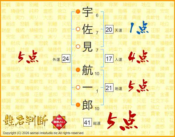 宇(6画)佐(7画)見(7画) 航(10画)一(1画)郎(10画)