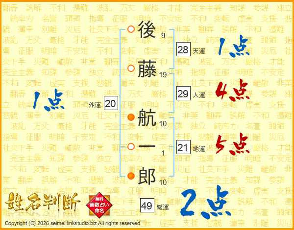 後(9画)藤(19画) 航(10画)一(1画)郎(10画)