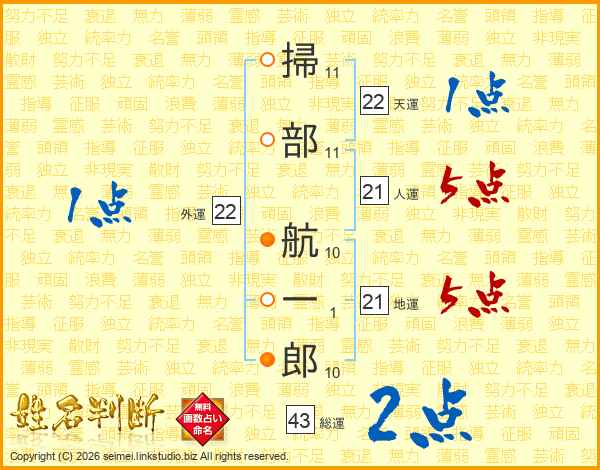 掃(11画)部(11画) 航(10画)一(1画)郎(10画)