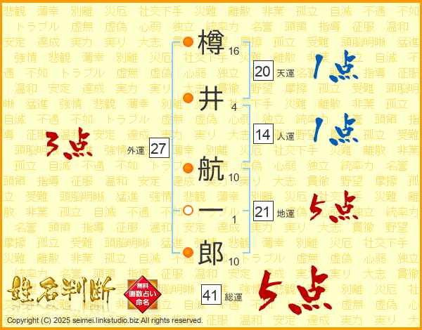 樽(16画)井(4画) 航(10画)一(1画)郎(10画)