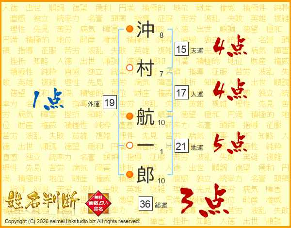 沖村航一郎さんの地運は21画の5点!
