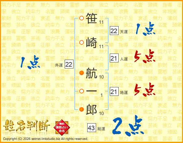 笹崎航一郎さんの人運は21画の5点!