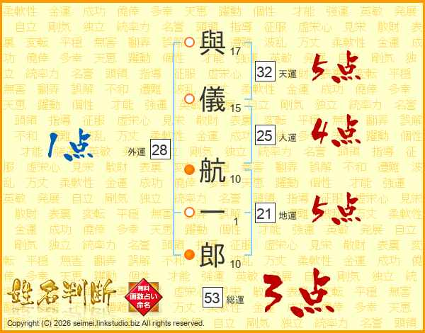 與(17画)儀(15画) 航(10画)一(1画)郎(10画)