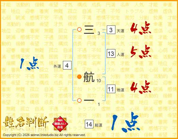 生活面を象徴する運勢です。外部から受ける影響力を表し、結婚運、家庭運や職場、環境への順応性を表します。総運から人運を引いた画数。姓や名が1文字の場合を除く。