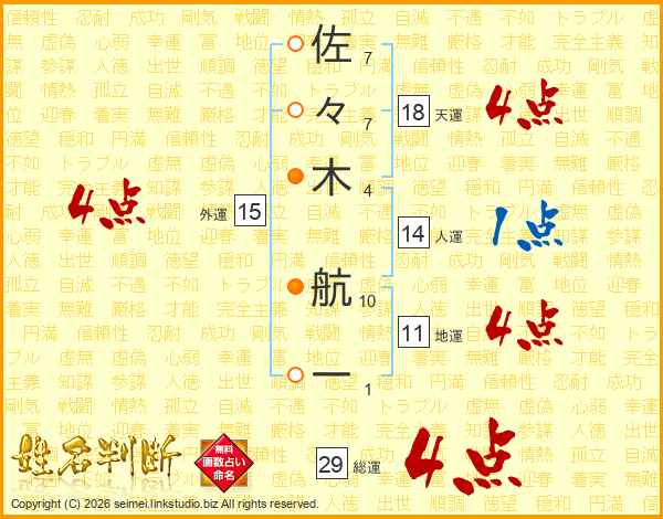 佐(7画)々(7画)木(4画) 航(10画)一(1画)