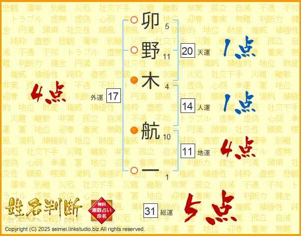 卯(5画)野(11画)木(4画) 航(10画)一(1画)
