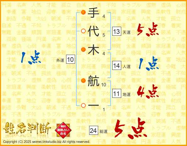 あなたの人生を表す1番重要な運勢です。生涯を通じて影響する総合運となり、主に50歳以降の晩年期に影響を及ぼします。苗字と名前の合計画数。