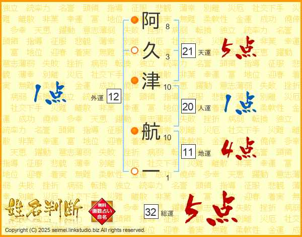 阿(8画)久(3画)津(10画) 航(10画)一(1画)