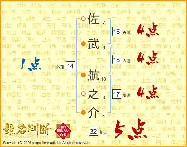 佐(7画)武(8画) 航(10画)之(3画)介(4画)