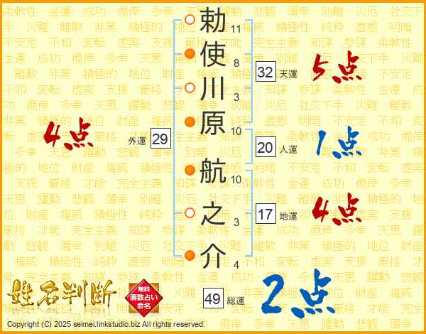 勅(11画)使(8画)川(3画)原(10画) 航(10画)之(3画)介(4画)