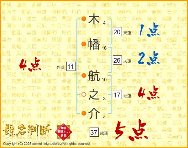 木(4画)幡(16画) 航(10画)之(3画)介(4画)