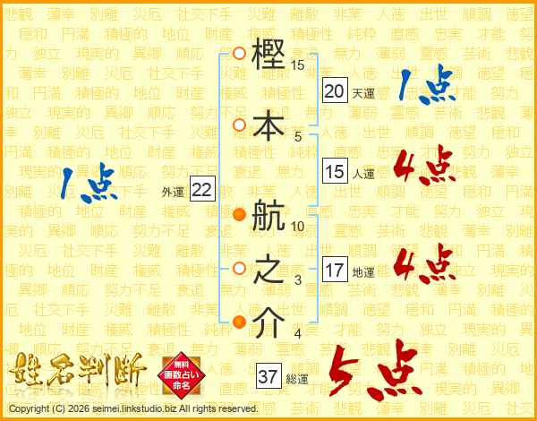 樫(15画)本(5画) 航(10画)之(3画)介(4画)