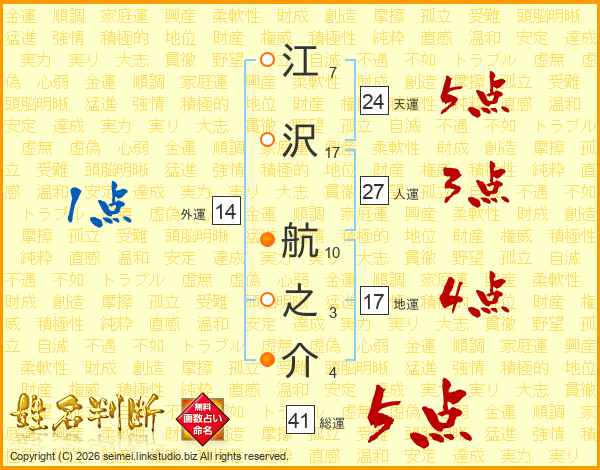 江沢航之介さんの総運は41画の5点!