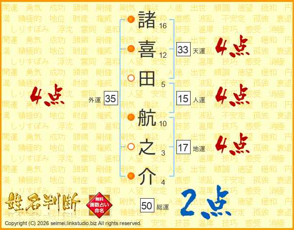 諸(16画)喜(12画)田(5画) 航(10画)之(3画)介(4画)