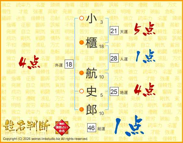 小(3画)櫃(18画) 航(10画)史(5画)郎(10画)
