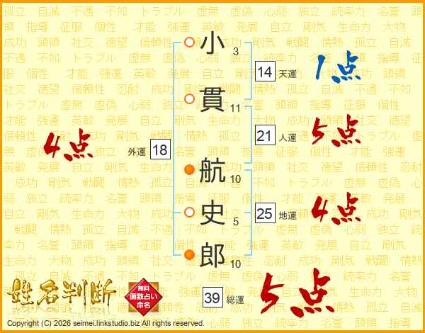 小貫航史郎さんの総運は39画の5点!