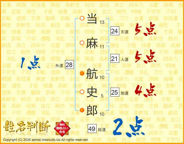 当(13画)麻(11画) 航(10画)史(5画)郎(10画)
