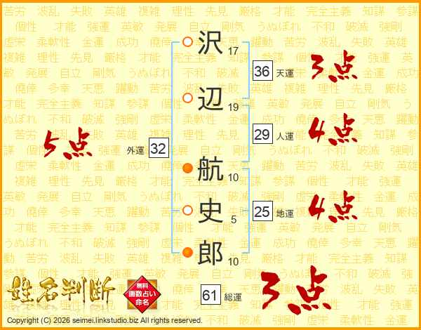 沢(17画)辺(19画) 航(10画)史(5画)郎(10画)
