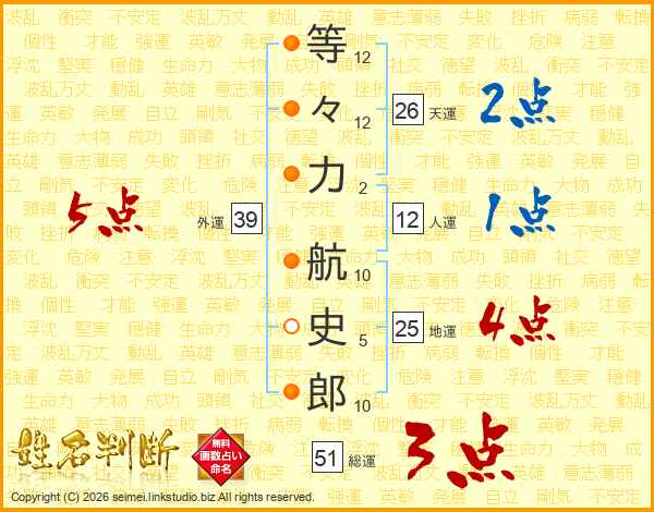 等(12画)々(12画)力(2画) 航(10画)史(5画)郎(10画)