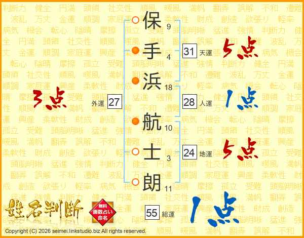保(9画)手(4画)浜(18画) 航(10画)士(3画)朗(11画)