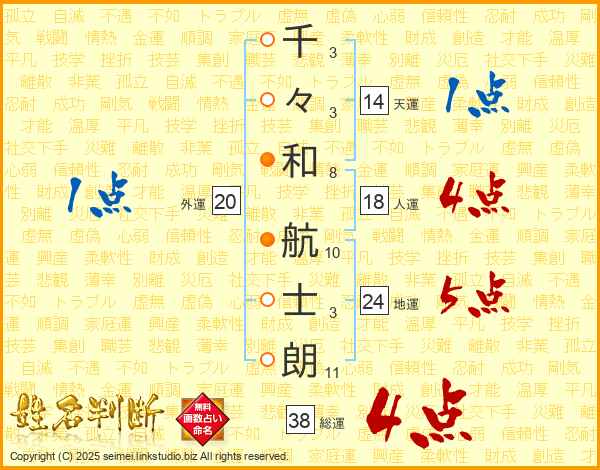 千(3画)々(3画)和(8画) 航(10画)士(3画)朗(11画)