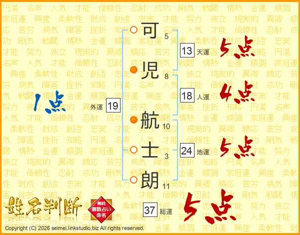 可(5画)児(8画) 航(10画)士(3画)朗(11画)