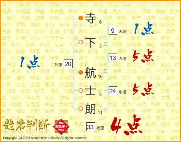 寺(6画)下(3画) 航(10画)士(3画)朗(11画)