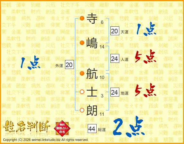 寺(6画)嶋(14画) 航(10画)士(3画)朗(11画)