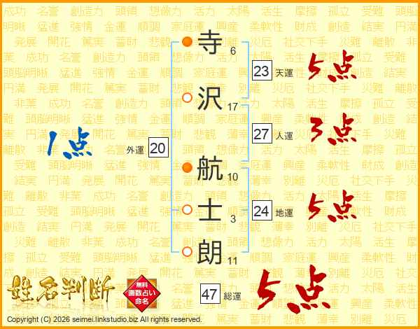 寺(6画)沢(17画) 航(10画)士(3画)朗(11画)