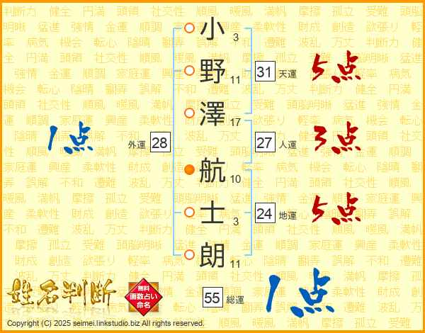 小(3画)野(11画)澤(17画) 航(10画)士(3画)朗(11画)