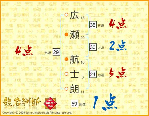 広(15画)瀬(20画) 航(10画)士(3画)朗(11画)