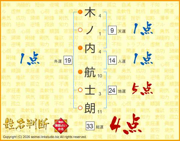 木(4画)ノ(1画)内(4画) 航(10画)士(3画)朗(11画)