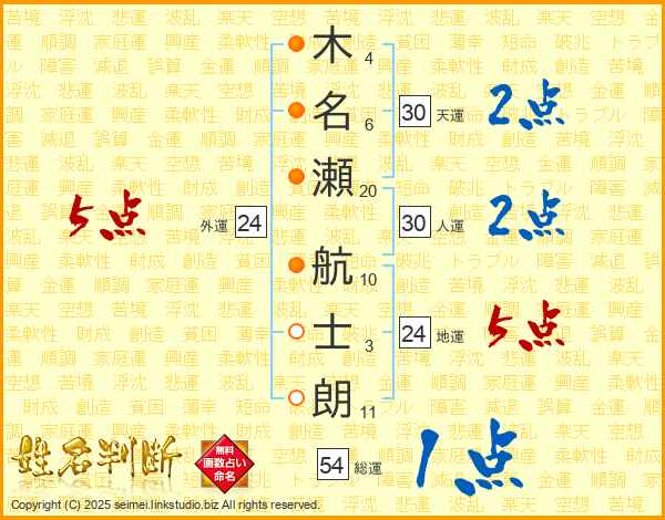 木名瀬航士朗さんの天運は30画の2点!