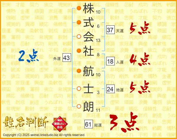 株(10画)式(6画)会(13画)社(8画) 航(10画)士(3画)朗(11画)